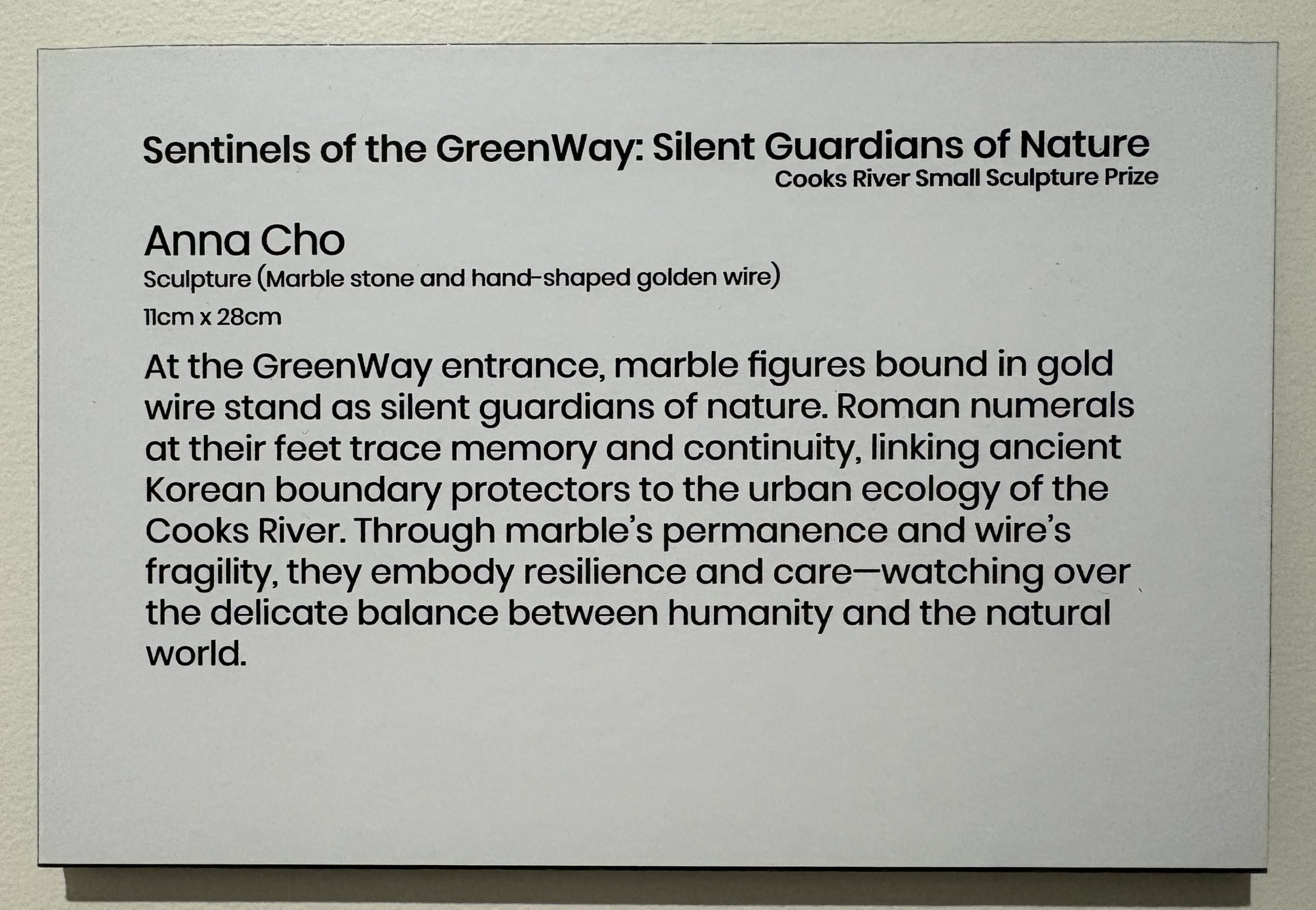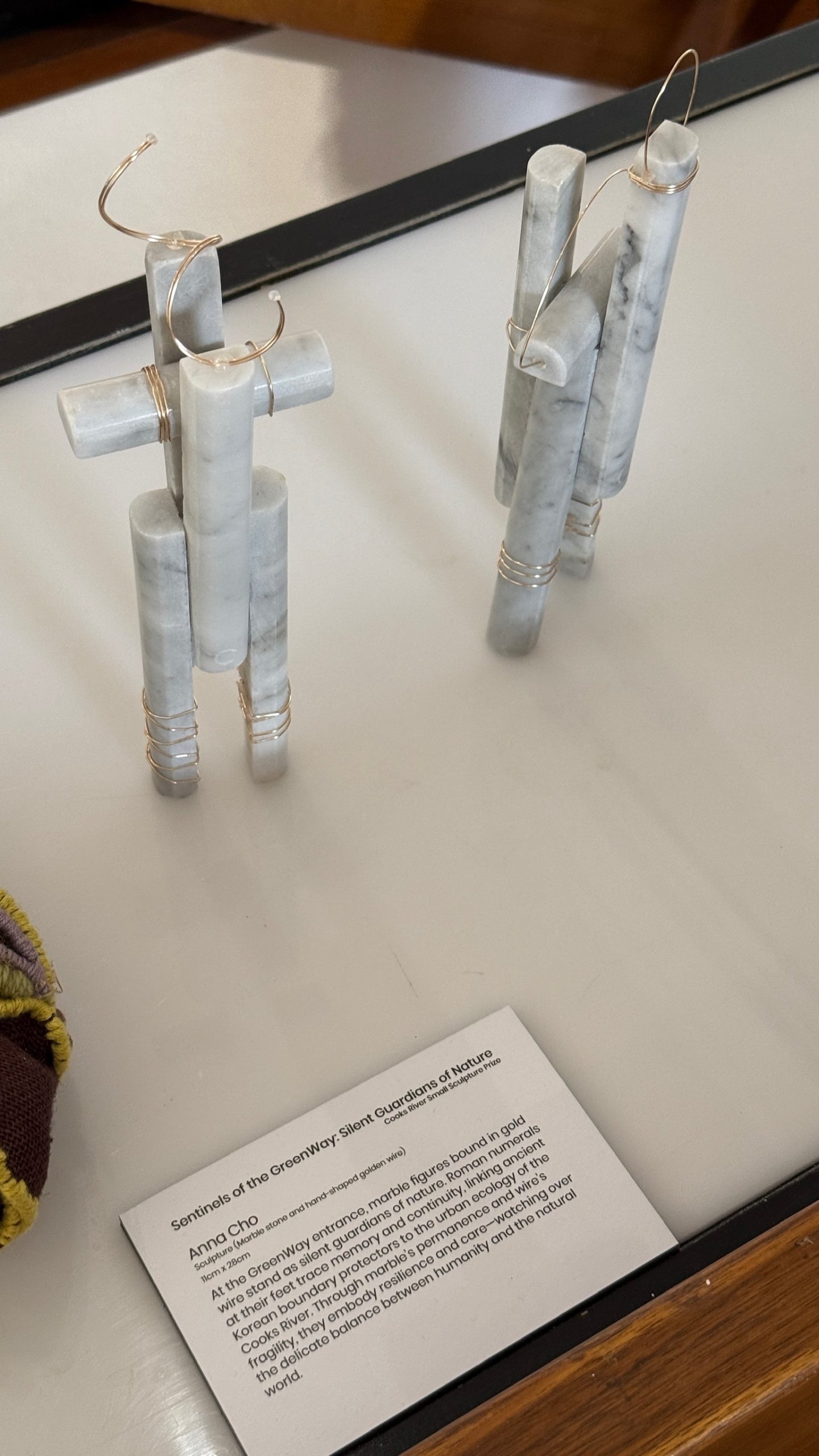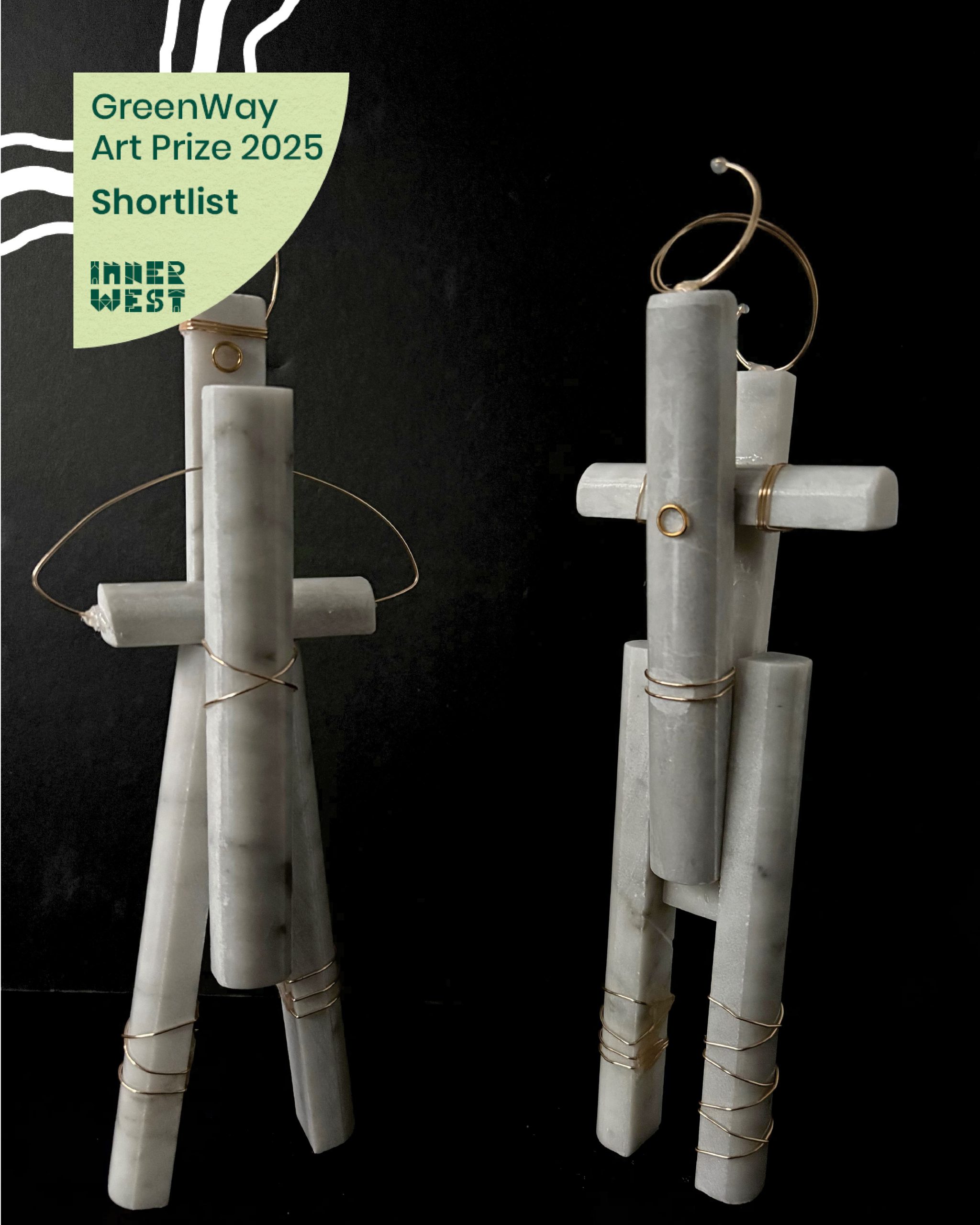 Marble figures wrapped in gold-toned wire stand at the entrance of the GreenWay as silent guardians of nature and the environment. Wire-formed Roman numerals bound to their legs trace the flow of memory, movement, and continuity. Inspired by traditional Korean boundary guardians, CheonhaDaejanggun & JihaYeojanggun, the figures connect ancient protective symbolism with the urban ecology of the Cooks River.