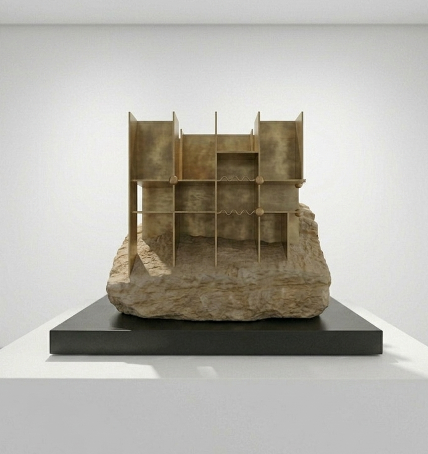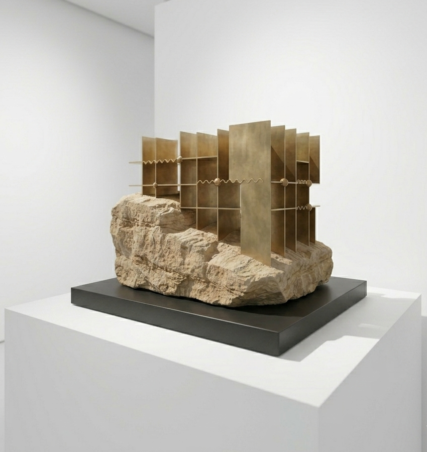By embedding precision-engineered brass into the organic strata of sandstone, the work manifests the Anthropocene as a period in which human data and natural matter have become an inseparable relic. It stands as a monument to the unseen, capturing a beautiful tension between the uncertainty of the infinitesimal and the absolute certainty of the stone.